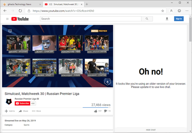 Bên cạnh đó, người dùng Microsoft Edge sẽ lưu ý thấy tính năng live chat cũng không hoạt động nốt. YouTube hiển thị một thông báo rằng trình duyệt của bạn cần được cập nhật, bởi trang web này nghĩ đó là phiên bản cũ. Khá oái ăm là làm gì có phiên bản Edge nào mới hơn cơ chứ?