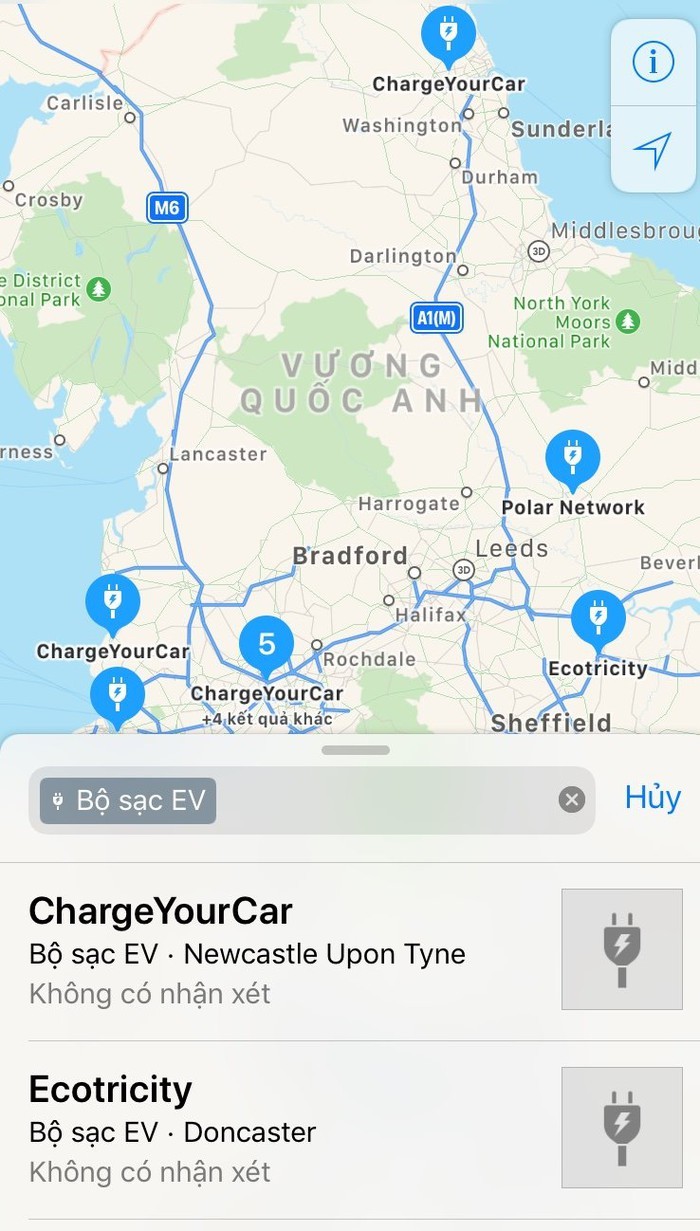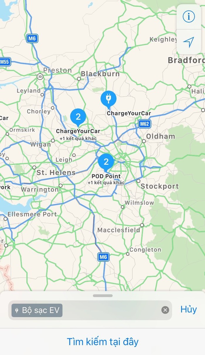 Bây giờ bạn chỉ cần ấn vào tiện ích "Tìm kiếm" bằng những từ khóa như "Bộ sạc EV" hoặc "Trạm sạc EV", bản đồ sẽ hiển thị tất cả trạm sạc cũng như thông tin chi tiết về các loại sạc, cổng sạc, hãng sạc EV phù hợp với thiết bị trong khu vực gần người dùng nhất. Ví dụ như thế này: