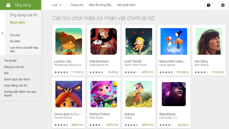 Bộ sưu tập trò chơi có nhân vật nữ chính trên Play Store. Nguồn: Google