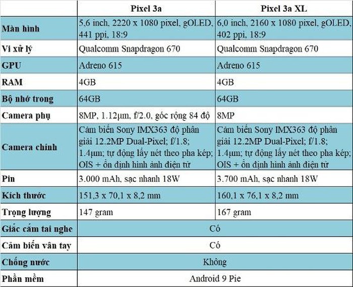 Không chỉ vậy, Pixel 3a và Pixel 3a XL còn đặc biệt ở chỗ cả hai đều sở hữu bảng thông số kỹ thuật tầm trung, không có một chiếc Pixel cao cấp nào khác để cạnh tranh với các mẫu flagship mới hiện nay.