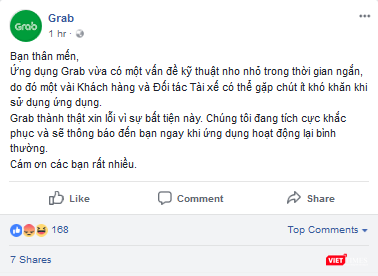 Vào lúc 21h ngày 3/4, dịch vụ gọi xe phổ biến nhất tại Đông Nam Á Grab đã thông báo trên Facebook rằng "công ty là đang gặp vấn đề kỹ thuật và sẽ gián đoạn trong một khoảng thời gian ngắn".
