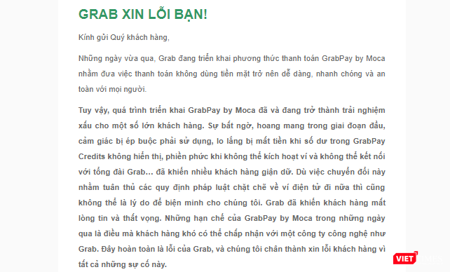'Grab đã khiến khách hàng mất lòng tin và thất vọng. Những hạn chế của GrabPay by Moca trong những ngày qua là điều mà khách hàng khó có thể chấp nhận với một công ty công nghệ như Grab. Đây hoàn toàn là lỗi của Grab, và chúng tôi chân thành xin lỗi khách hàng vì tất cả những sự cố này", đại diện Grab cho biết