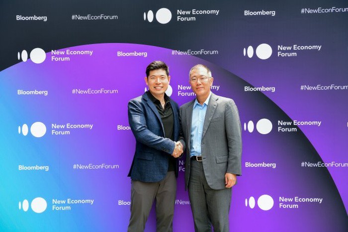 CEO Anthony Tan của Grab (trái) và Euisun Chung - Phó chủ tịch điều hành của Hyundai Motor Group (phải) bắt tay thỏa thuận, đánh dấu khoản đầu tư trị giá 250 triệu USD mới nhất.