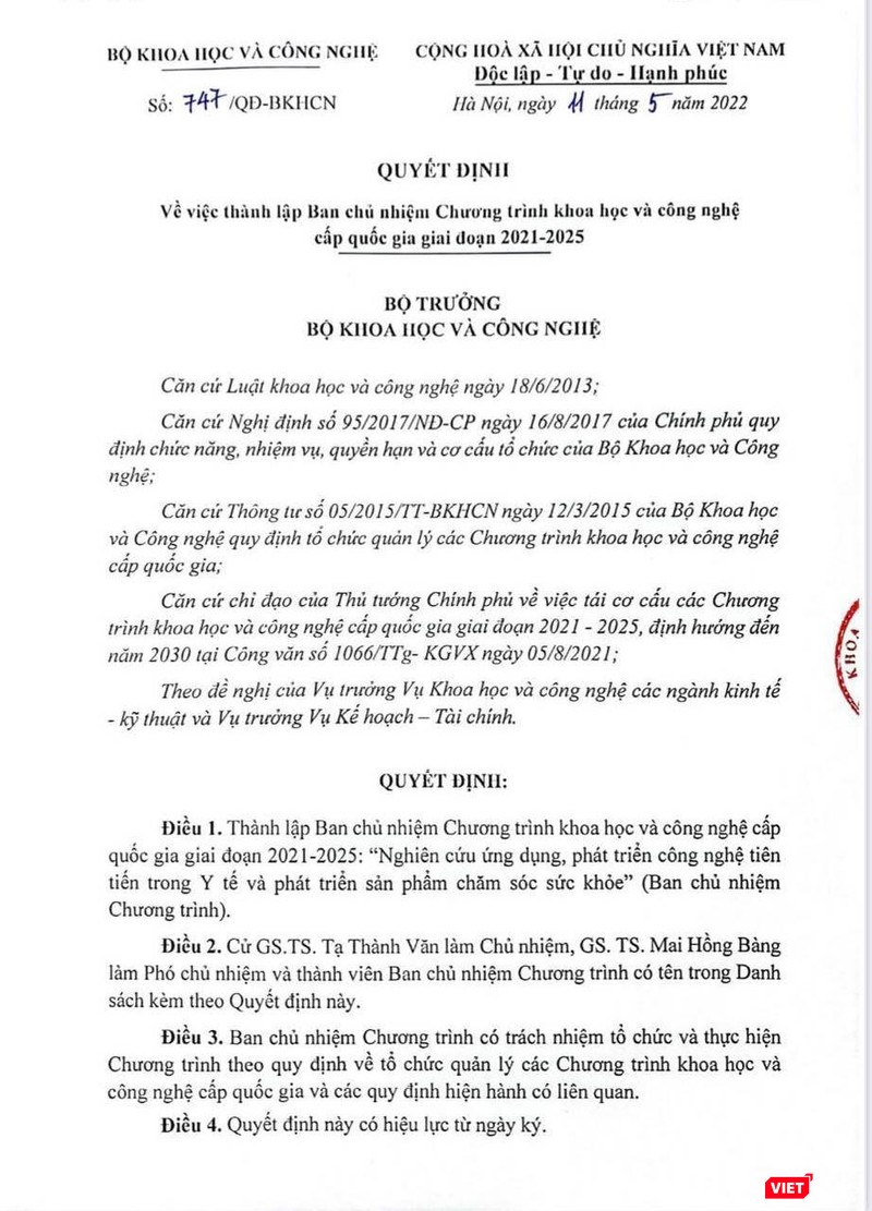 Ban Chủ nhiệm Chương trình KH&CN cấp quốc gia giai đoạn 2021-2025: “Nghiên cứu ứng dụng, phát triển công nghệ tiên tiến trong Y tế và phát triển sản phẩm chăm sóc sức khỏe” gồm 5 thành viên. GS.TS. Tạ Thành Văn được cử làm Chủ nhiệm Chương trình và GS. TS. Mai Hồng Bàng – Giám đốc Bệnh viện Trung ương Quân đội 108 - làm Phó Chủ nhiệm.