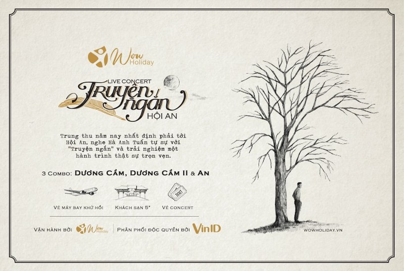 Lần này, sự xuất hiện của Hà Anh Tuấn chắc chắn sẽ rất đặc biệt. Và còn gì tuyệt vời hơn khi bay Vietnam Airlines, ở Vinpearl, ngắm trăng trên sông Hoài và nghe nhạc Hà Anh Tuấn. Đó thực sự là trải nghiệm, là khoảnh khắc không nên bỏ lỡ trên đời. Người hâm mộ sẽ nhận được món quà đặc biệt có chữ kí Hà Anh Tuấn khi lựa chọn một trong những combo: Dương Cầm, Dương Cầm II, An và. An phiên bản 2. Toàn bộ combo sẽ được phân phối độc quyền trên VinID và triển khai vận hành bởi WOWHOLIDAY.