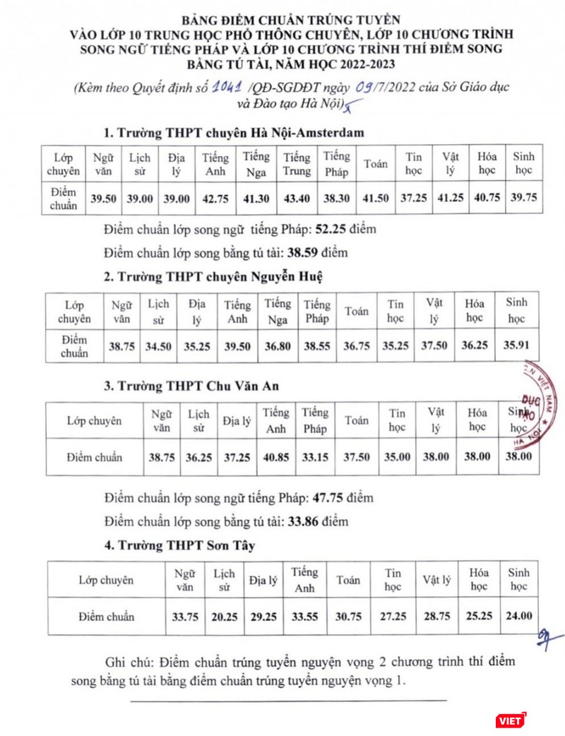 Trưa nay (9/7), Sở Giáo dục và Đào tạo Hà Nội vừa công bố điểm chuẩn vào các trường THPT chuyên và lớp 10 chương trình song ngữ tiếng Pháp và lớp 10 chương trình thí điểm song bằng tú tài năm học 2022- 2023 trên địa bàn, gồm: Trường THPT chuyên Hà Nội - Amsterdam, Trường THPT chuyên Nguyễn Huệ, Trường THPT Chu Văn An và Trường THPT Sơn Tây.