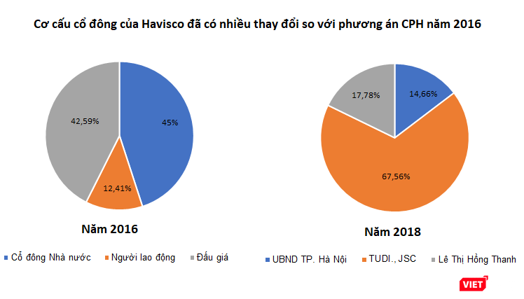 Tuy nhiên, tính tới ngày 31/12/2017, bên cạnh cổ đông Nhà nước (chiếm 46,2% vốn điều lệ), cơ cấu cổ đông của Havisco chỉ có sự góp mặt của CTCP Đầu tư phát triển đô thị và thương mại (TUDI.,JSC) với 42,59% và cá nhân bà Lê Thị Hồng Thanh (chiếm 11,21%).