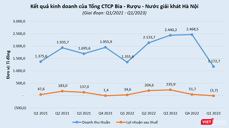 Trừ đi các chi phí khác và thuế, Habeco báo lỗ ròng 3,7 tỉ đồng trong quý 1/2023, trong khi cùng kỳ năm trước có lãi 34,5 tỉ đồng. Đây cũng là lần đầu tiên Habeco báo lỗ sau 12 quý liên tiếp kể từ quý 2/2020.