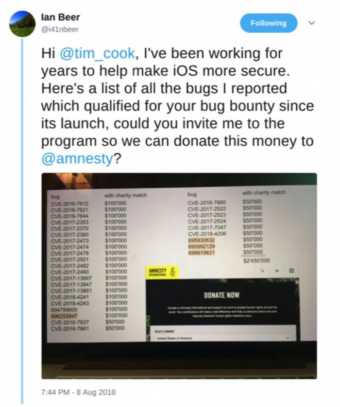 Cách đây ít ngày tại hội thảo an ninh Black Hat diễn ra ở Las Vegas (Mỹ), Beer đã tweet một bài đăng đến CEO Apple là Tim Cook, thách thức ông ta trả tiền cho các lỗ hổng được anh báo cáo từ năm 2016, cụ thể là quyên góp 2,45 triệu USD cho nhóm nhân quyền Amnesty International.