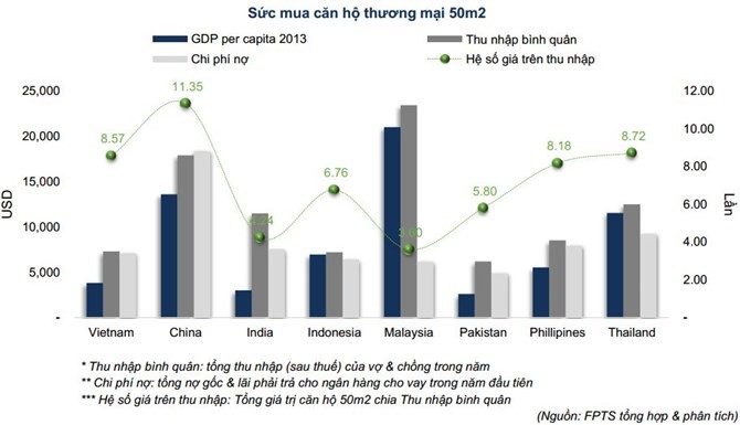 Báo cáo này phân tích, căn cứ số liệu thống kê như bảng trên có thể thấy ngay rằng, với mức thu nhập thấp như vậy (trừ Malaysia) thì một cặp vợ chồng cùng góp hết tiền lại với nhau vẫn không thể mua nổi một căn hộ chung cư thương mại diện tích 50m2.