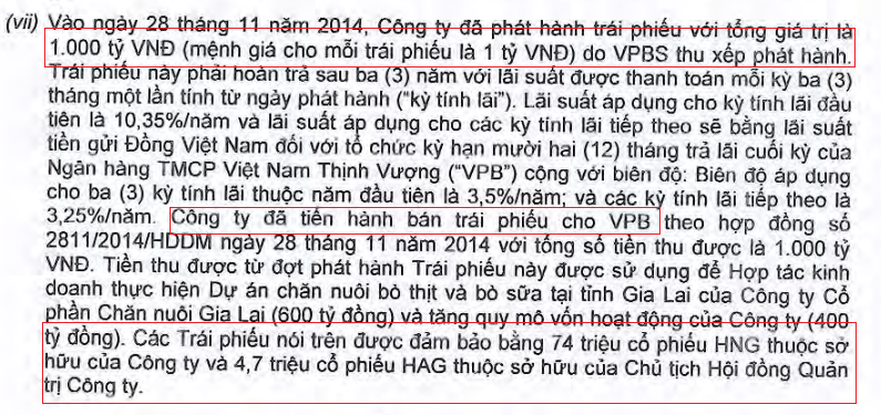 1.000 tỷ đồng trái phiếu bán cho VPBank ngày 28/11/2014 với tài sản đảm bảo là 74 triệu cổ phiếu HNG của công ty và 4,7 triệu cổ phiếu HAG của “bầu” Đức.