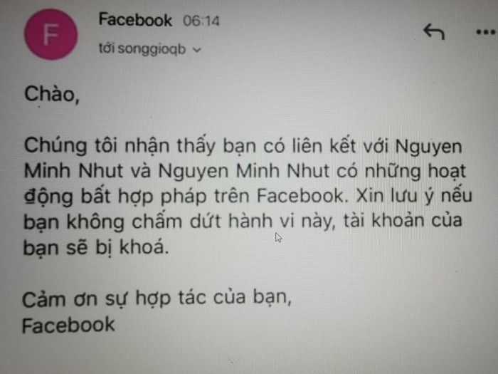 "Chúng tôi nhận thấy bạn có liên kết với Nguyen Minh Nhut và Nguyen Minh Nhut có hoạt động bất hợp pháp trên Facebook. Xin lưu ý bạn không chấm dứt hành vi này, tài khoản của bạn sẽ bị khóa", nội dung email Facebook gửi đến người dùng.