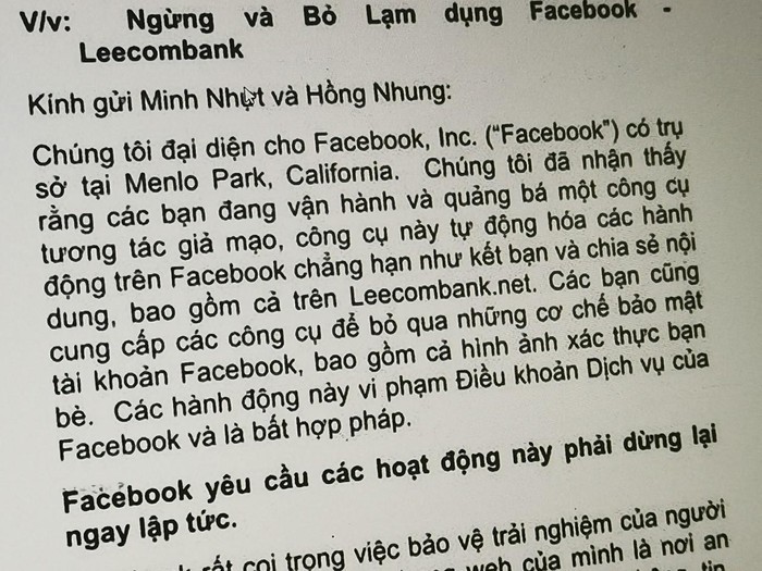 Cùng với việc thông báo, Facebook yêu cầu hệ thống tương tác ảo trên phải chấm dứt hoạt động, bồi thường thiệt hại nếu có... Nếu không thực hiện các yêu cầu trên, Facebook sẽ xóa tài khoản của Nguyen Minh Nhut.