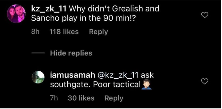 Tài khoản tên kz_zk_11 bình luận: “Tại sao không tung Grealish và Sancho vào 90 phút thi đấu chính thức của trận đấu!?”. Ngay lập tức sau đó tài khoản tên iamusamah trả lời: “ Hãy hỏi Southgate. Chiến thuật quá tệ.” kèm theo đó là icon bày tỏ sự thất vọng đối với vị thuyền trưởng này.
