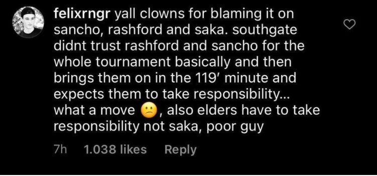 Một tài khoản tên felixrngr bình luận: “Các bạn là một lũ hề vì đã chỉ trích Sancho, Rashford, và Saka. Southgate thậm chí không hề tin tưởng Rashford và Sancho trong suốt giải và sau đấy tung họ vào phút 119 mà muốn họ nhận lấy trách nhiệm thực hiện quả đá luân lưu… một nước đi không thể lường trước được, đáng ra các cầu thủ có kinh nghiệm cần phải thực hiện quả đá luân lưu chứ không phải Saka, tội nghiệp anh”.