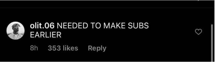 Tài khoản tên olit.06 bình luận: "Cần phải thay đổi người sớm hơn". Bình luận này tỏ rõ sự thất vọng đối với HLV trưởng của ĐT Anh khi ông đã không tung những cầu thủ có thể tạo nên sự đột biến vào sân sớm hơn và giữ những cầu thủ đã thi đấu rất mờ nhạt trên sân đến tận hiệp phụ.
