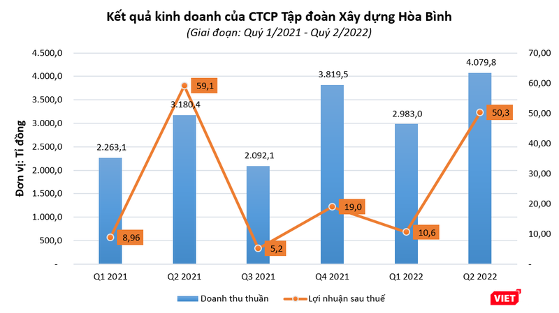Lũy kế 6 tháng đầu năm 2022, doanh thu thuần và lợi nhuận sau thuế của HBC đạt 7.062,7 tỉ đồng và 60,8 tỉ đồng, lần lượt tăng 30% và giảm 10% so với cùng kỳ năm 2021.