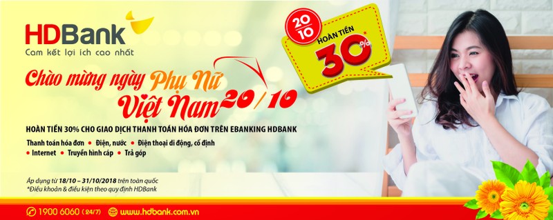 HDBank cho biết chương trình ưu đãi này nhằm hướng đến việc tôn vinh phái đẹp nhân Ngày Phụ nữ Việt Nam 20/10 và tri ân các khách hàng đang sử dụng dịch vụ ngân hàng điện tử của ngân hàng.
