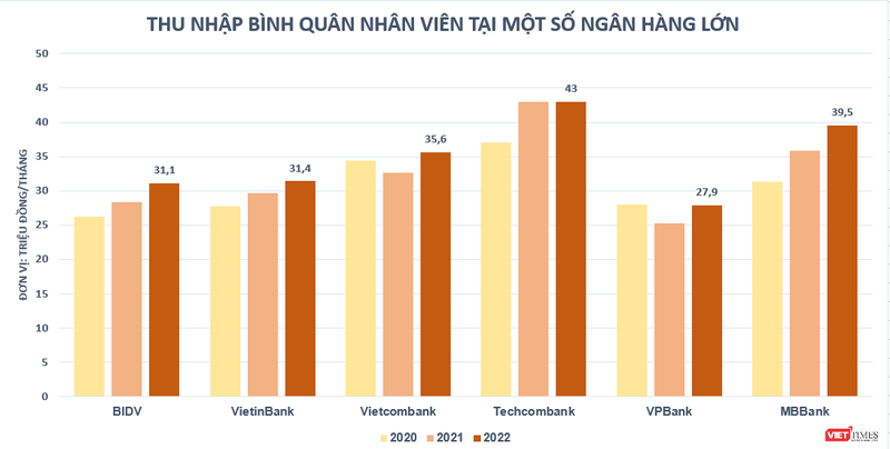 Theo thống kê của VietTimes, trong năm 2022, thu nhập bình quân của nhân viên ở phần lớn các ngân hàng đều ghi nhận tăng so với năm trước từ 5,7 – 10,3%.