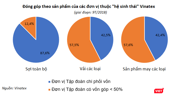 Trong đó, các "Đơn vị Tập đoàn chi phối vốn" (bao gồm: các đơn vị phụ thuộc, công ty 100% vốn Vinatex, công ty có vốn Vinatex trên 50%) đạt 15.945 tỷ đồng; các "Đơn vị Tập đoàn có vốn góp dưới 50%" ghi nhận giá trị cộng dồn là 20.913 tỷ đồng.