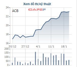 Trong khi đó cổ phiếu ACB của Ngân hàng TMCP Á Châu (ACB) cũng có biến động không kém gì STB khi liên tục tăng trong tháng vừa qua. Thậm chí với các bước giá tăng mạnh hơn ở mỗi phiên, kết thúc 1 tháng giao dịch cổ phiếu ACB dù giảm 4 phiên và 3 phiên đi ngang song lại tăng tới 33,5%, từ mức 17.300 đồng lên 23.100 đồng/cổ phiếu.