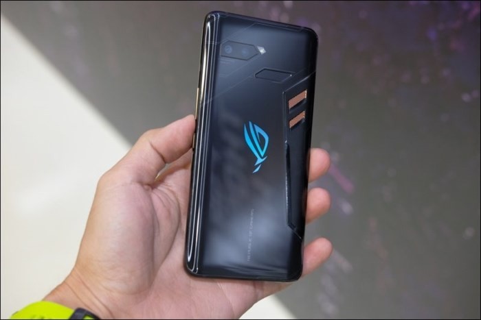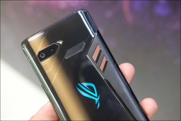 ROG Phone có vẻ ngoài hầm hố, loa ngoài lớn, đồng thời có logo ROG thay đổi nhiều màu khác nhau.