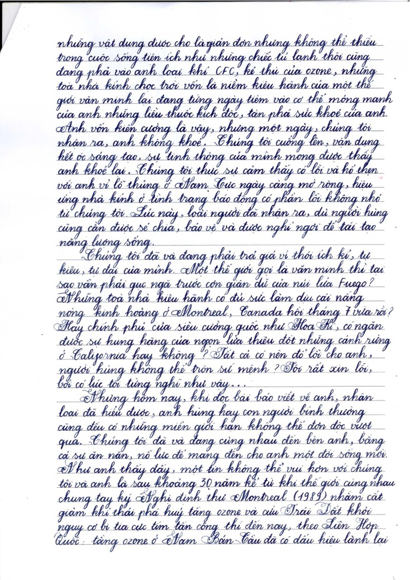Giành giải Nhất năm nay là bức thư về đề tài môi trường, rất sáng tạo và độc đáo trong cách đặt vấn đề và giải quyết vấn đề, cách trình bày lôgic, chặt chẽ, thông điệp ý nghĩa. Chủ nhân của bức thư gây bất ngờ cho người đọc khi em viết về người hùng của mình là tầng Ozon. Ozon khổng lồ và mạnh mẽ, Ozon bao bọc và bảo vệ con người trong vòng tay đầy khoan dung, trong khi con người không ngừng làm tổn thương người hùng sự sống của mình. Người hùng ấy đang bị ốm, đang cần được con người chăm sóc, bảo vệ và giữ gìn. Bức thư đã nhận được sự đồng thuận cao của các thành viên Ban Giám khảo.