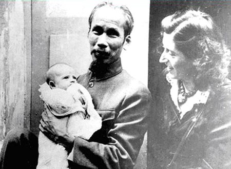 Chủ tịch Hồ Chí Minh bế con gái nuôi Elizabeth bên cạnh bà Lucie Aubrac