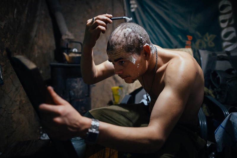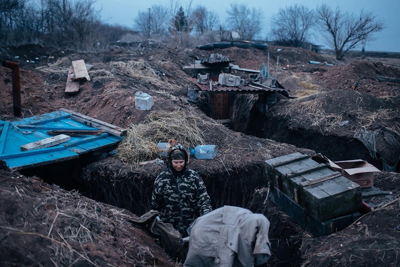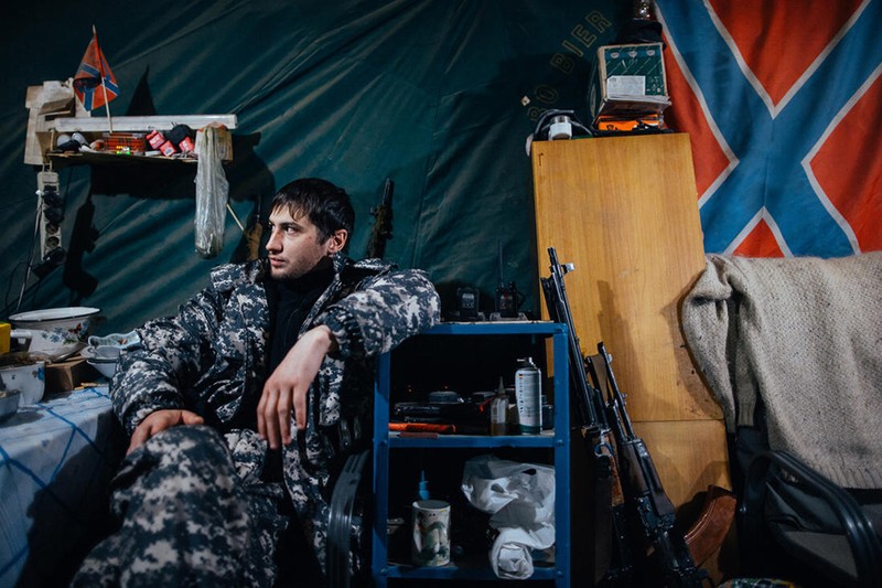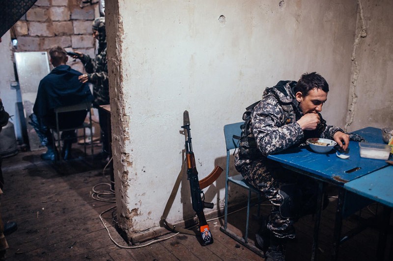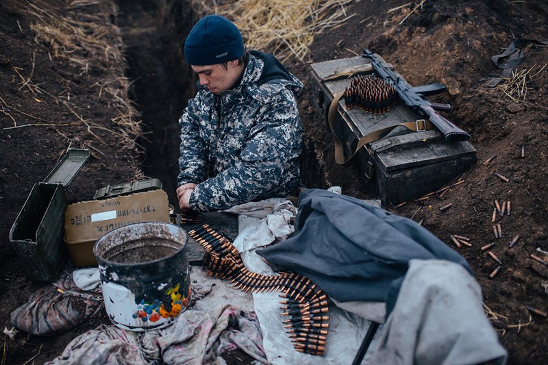 Trong 1 căn hầm, một dân quân đang lắp đạn vào dây băng PKMS, có khi sắp tới không có thời gian