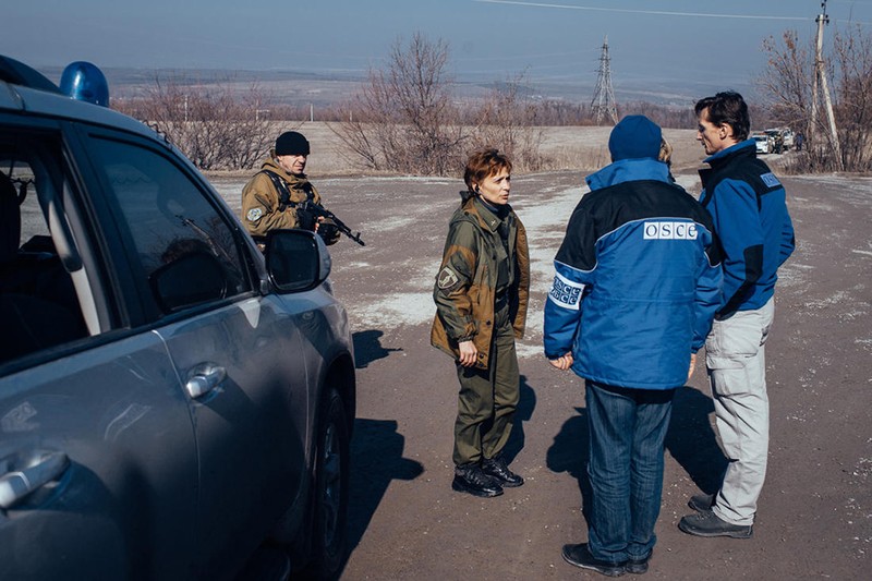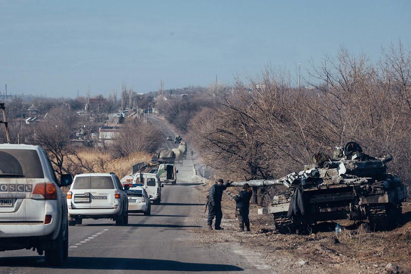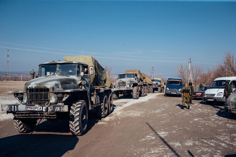 Những ô tô của sứ mệnh OSCE hộ tống đoàn xe quân sự đang trên đường từ Gorlovka về phía sau theo thỏa thoạn lùi các pháo phản lực tự hành MLRS của Donbass.