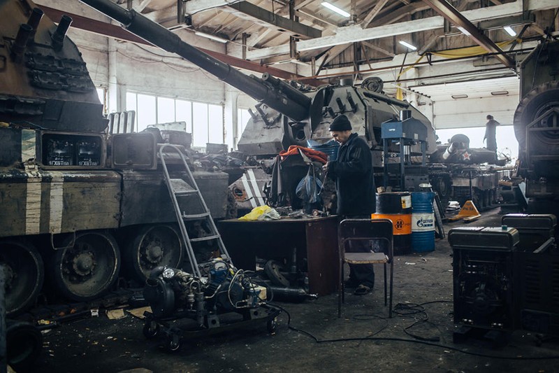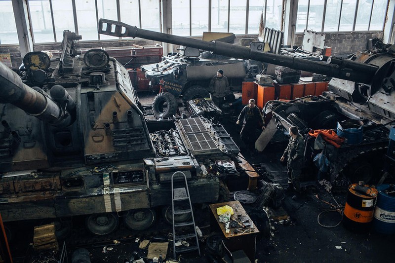 Khu xưởng sủa chữa của tiểu đoan "Vostok" vùng ngoại ô Donetsk. Trong ảnh - pháo tự hành 2S19 "Msta-S" 152 mm, chiến lợi phẩm ở Starobeshevo.
