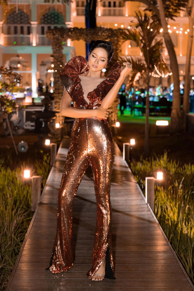 Nếu như tại cuộc thi Miss Universe, chiếc váy được thiết kế ngắn bó sát giúp H'Hen Niê khoe được đôi chân dài thẳng tắp thì lần này chiếc váy đã trở thành jumpsuit, đem đến sự độc đáo và nổi bật cho hình ảnh cá tính của H'Hen Niê.