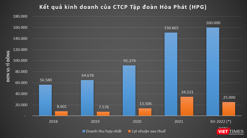 Theo đó, năm 2022, Hòa Phát đặt mục tiêu doanh thu 160.000 tỉ đồng, tăng 6% so với năm trước. Kế hoạch lợi nhuận sau thuế trong khoảng từ 25.000 – 30.000 tỉ đồng, giảm 13-28% so với thực hiện năm 2021.