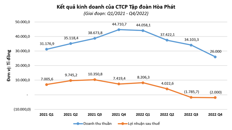 CTCP Tập đoàn Hòa Phát (Mã CK: HPG) vừa công bố kết quả kinh doanh quý 4/2022 với doanh thu đạt 26.000 tỉ đồng, giảm 42% so với cùng kỳ năm trước và lợi nhuận sau thuế âm gần 2.000 tỉ đồng, cao hơn khoản lỗ 1.785 tỉ đồng trong quý 3/2022.