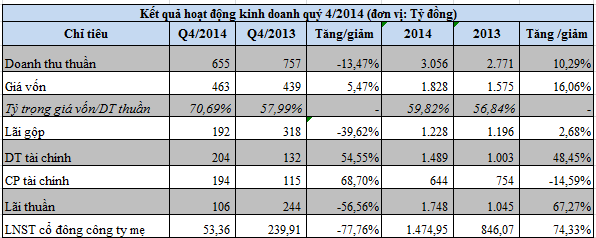 Trong riêng quý 4/2014, cả doanh thu và lợi nhuận của Hoàng Anh Gia Lai đều sụt giảm đáng kể so với cùng kỳ.