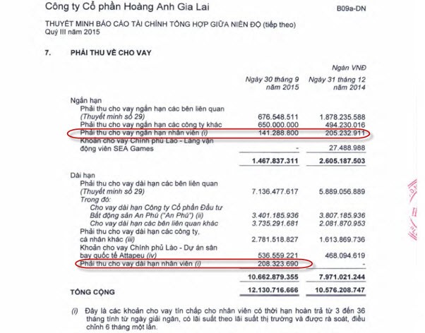 Trong BCTC công ty mẹ Quý 3/2015 của HAG chỉ rõ, các khoản vay 141 tỷ (cho vay ngắn hạn nhân viên) và bất ngờ xuất hiện số tiền 208 tỷ (cho vay dài hạn nhân viên) đều là vay tín chấp.