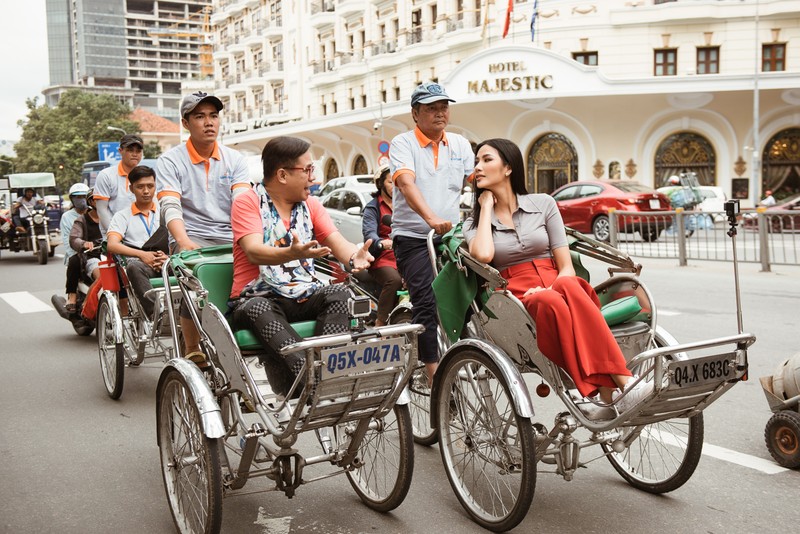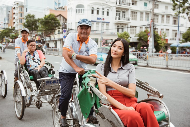 Tiếp theo đó, Hoàng Thùy đã cùng Santos Anjo trải nghiệm xích lô - một điểm đặc trưng của Sài Gòn. Hoàng Thùy chia sẻ rằng: “Đây là lần đầu tiên Thùy đi xích lô và cảm giác rất là thú vị”. Cô còn hài hước đùa với chú đạp xích lô “Con không nặng đúng không chú? Con nhẹ lắm ạ”.