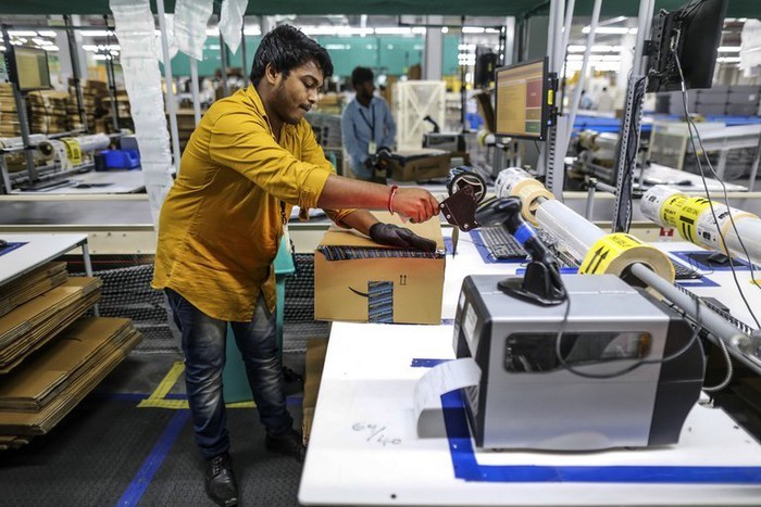 Một nhân viên đang làm việc tại trung tâm giao nhận của Amazon tại Hyderabad, Ấn Độ. Ảnh: Bloomberg