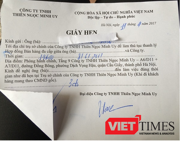 Người này cho biết thêm, bà nhận được thông tin công ty Thiên Ngọc Minh Uy bị rút giấy phép, ngừng hoạt động, nhưng số tiền bà gửi vào công ty này đến tận tháng 6 mới được công ty giải quyết.