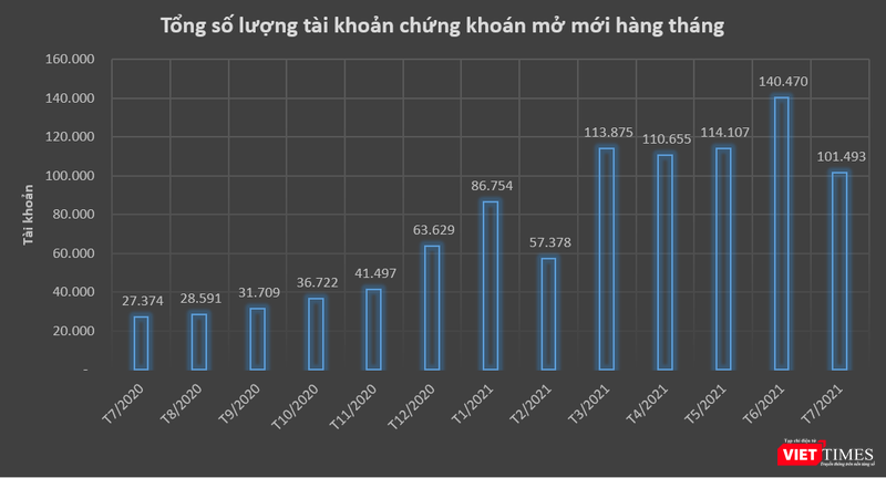 Số liệu từ Trung tâm Lưu ký Chứng khoán Việt Nam (VSD) cho biết, nhà đầu tư cá nhân trong nước tiếp tục mở mới 101.078 tài khoản trong tháng 7/2021, giảm 27,8% so với số tài khoản mở mới trong tháng 6. Tuy nhiên, đây vẫn là tháng thứ 5 liên tiếp cá nhân trong nước mở mới trên 100.000 tài khoản.