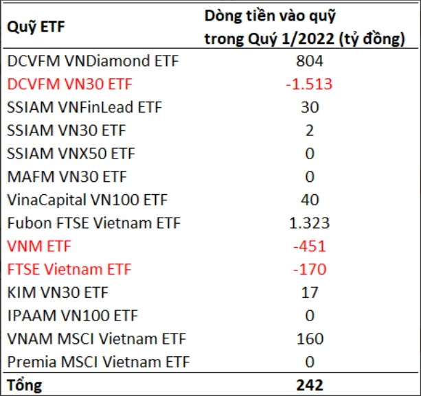 Chiều ngược lại, DCVFM VN30 ETF đã bị rút vốn khá mạnh trong quý 1/2022 với giá trị 1.513 tỷ đồng và cũng là quỹ ETF bị rút vốn mạnh nhất thị trường. Thời gian qua, nhà đầu tư Thái Lan có xu hướng rút bớt vốn khỏi DCVFM VN30 ETF. Ngoài ra, không loại trừ trường hợp các nhà đầu tư Hàn Quốc cũng rút vốn khỏi DCVFM VN30 ETF để chuyển sang quỹ VN30 ETF do các công ty quản lý quỹ Hàn Quốc quản lý.
