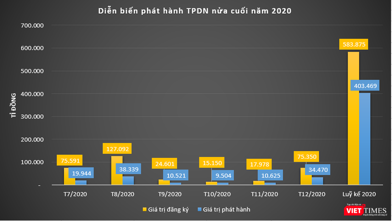 Theo đó, trong tháng 12/2020, có 98 đợt đăng ký phát hành với tổng giá trị đăng ký lên tới 75.350 tỉ đồng, cao gấp 4,2 lần so với tháng trước. Trong đó, có 47 đợt phát hành thành công đến từ 35 doanh nghiệp, huy động được 34.470 tỉ đồng, chiếm 45,7% tổng giá trị đăng ký.