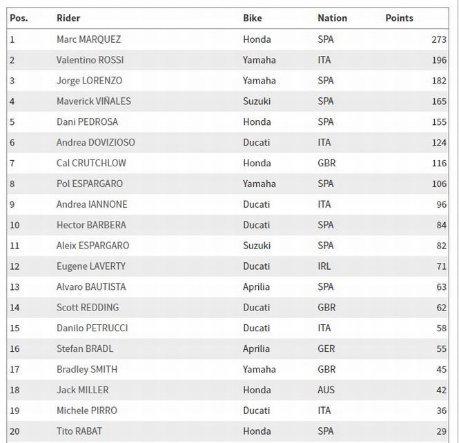 Đến thời điểm này, không khí cuộc đua đã trở nên khá trầm lắng khi Marquez đã tạo ra được khoảng cách an toàn với những đối thủ phía sau. Đến vòng đua thứ 17, ngôi sao trẻ của Suzuki – Maverick Vinales sau khoảng thời gian đầu gần như mất hút đã dần bám sát được với top đầu. Và đến vòng 18, Vinales đã vượt qua được đồng đội Espargaro để vươn lên vị trí thứ tư.