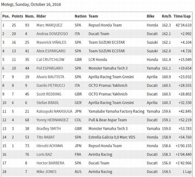 Với thắng lợi ở cuộc đua ở Motegi, Marc Marquez đã chính thức đăng quang chức vô địch MotoGP 2016. Danh hiệu này càng có ý nghĩa hơn nữa với ngôi sao số 93 khi anh đã lên ngôi ngay trên trường đua của Honda và đây cũng là năm kỉ niệm mùa giải thứ 50 mà nhà sản xuất Nhật Bản tham gia giải MotoGP.