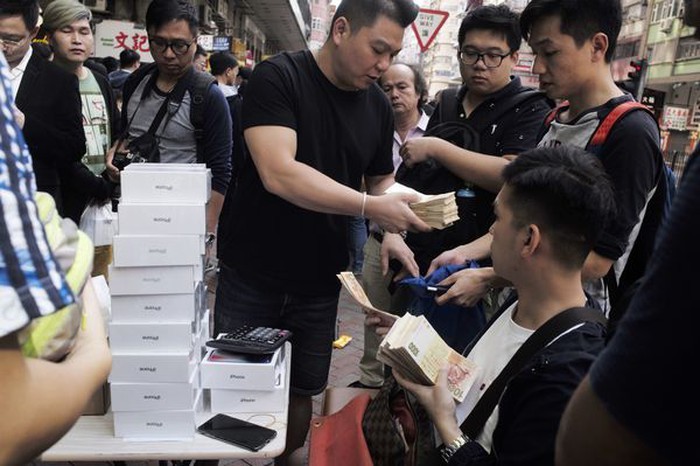 Tại Việt Nam, người dùng phải chờ đến cuối tháng 10 mới có máy chính hãng, trong khi những quốc gia lân cận như Singapore hay Hồng Kông nằm trong nhóm mở bán đầu tiên và bên cạnh những Apple Store sang chảnh đông khách thì đã có không ít cửa hàng lưu động được mở bên lề đường như thế này.