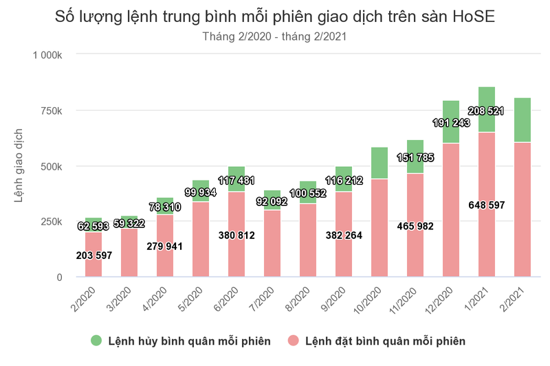 Vào tháng 6/2020, các số liệu trên tương ứng gần 2,6 triệu lệnh huỷ sửa trên tổng số gần 8,4 triệu lệnh giao dịch trong tháng, chiếm tỷ trọng 30,85%. Đến tháng 12/2020, số lệnh huỷ, sửa tăng vọt lên gần 4,4 triệu lệnh trên tổng 13,85 triệu lệnh giao dịch, chiếm tỷ trọng 31,76%.