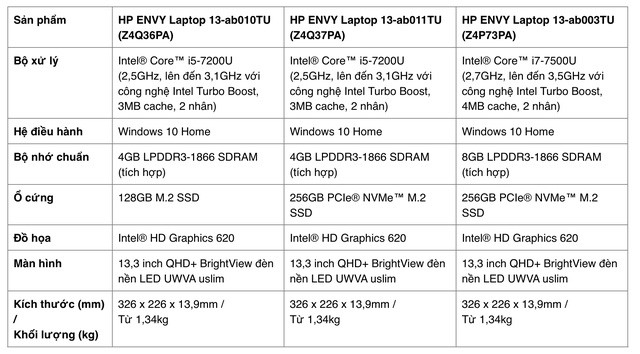 Thông số kỹ thuật của HP Envy 13,3 inch.
