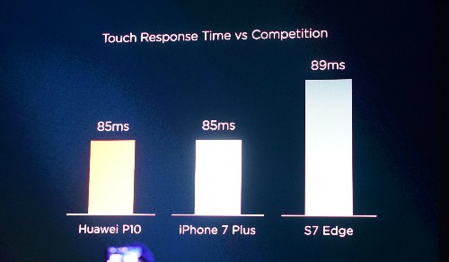 Trong sự kiện, Huawei nhiều lần mang iPhone 7/7 Plus và Samsung Galaxy S7/S7 edge vào so sánh. Với cảm biến mới, Huawei đưa ra thống kê rằng P10 nhanh hơn 4 giây so với S7 edge và bằng iPhone 7.