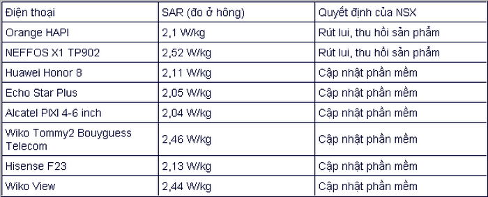 Trong nửa đầu 2018, ANFR kiểm tra 51 thiết bị và 43 được thông qua. 8 mẫu còn lại thì không, bạn có thể xem trong bảng dưới đây. Lưu ý giá trị trong bảng được đo ở hông nhưng ANFR còn đo cả mức độ hấp thụ sóng ở đầu. Các nhà sản xuất vi phạm có hai cách xử lý: khắc phục qua cập nhật phần mềm hoặc thu hồi sản phẩm, rút khỏi thị trường.