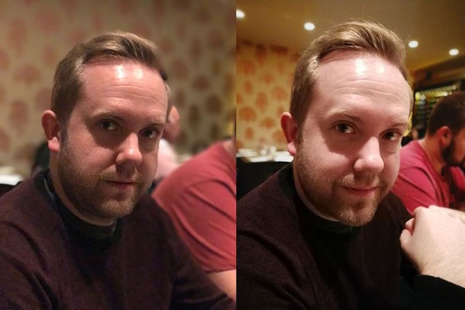 Bức ảnh này chụp ở trong một nhà hàng thiếu ánh sáng. Trong ảnh chụp từ iPhone thì nhân vật có khuôn mặt tự nhiên hơn, vì để có cùng góc nhìn thì người chụp phải đưa camera trên P10 vào sát mặt, khiến cho mặt bị méo. Tuy nhiên chiếc iPhone cho ra ảnh tối và nhiễu.